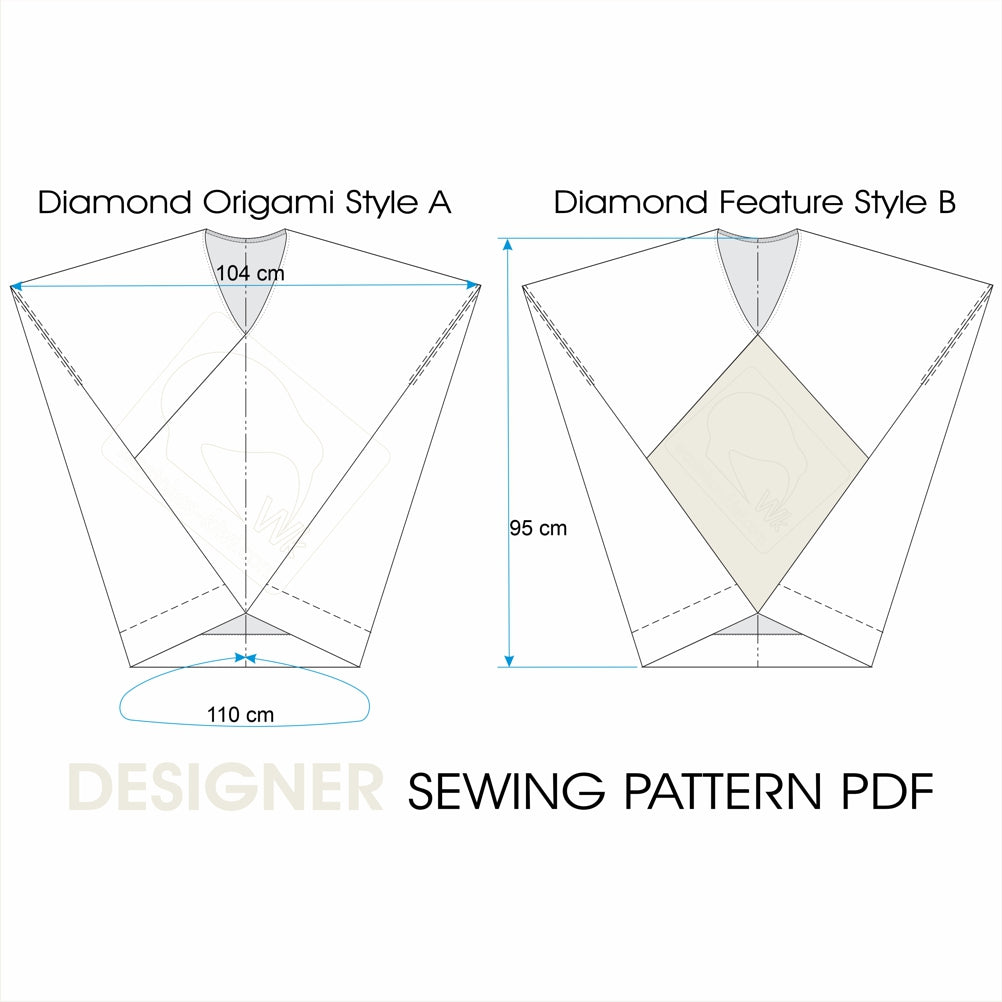 What's included with the PDF: The Diamond Dress-MINI Pattern PDF has been drafted in full-size and can be printed as large format: as 2 x A0 sheets; or tiled as 36 x A4 sheets. This Pattern contains 2 Styles: A + B, where A is the original Origami pattern and Style B features a central Diamond panel. Owing to the sheer brilliance and simplicity of this designer dress, we have also provided a "Dimension Drawing" along with a "Sectional Detail PDF" that provides you with the option to hand draft the pattern in full scale on your own paper. And it comes with a scaled down A3 version (Origami Practice) that provides a tactile opportunity to visualise the Origami folds within a 3-dimensional maquette to assist you, as you cut & sew your own Diamond Dress.